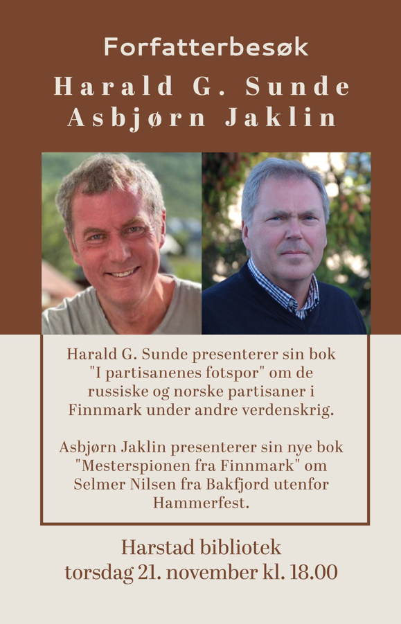 Det er siste bok fra Alf R. Jacobsen. Forfatteren kommer til Harstad bibliotek